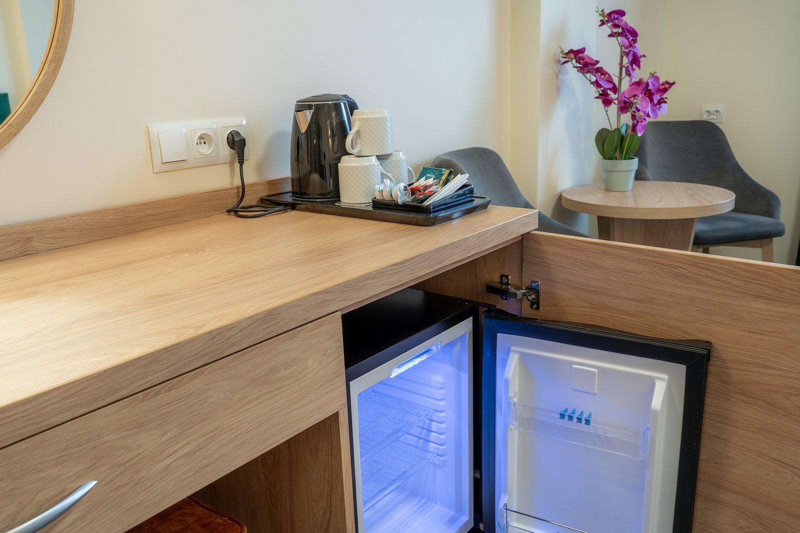 Lodówka hotelowa, czajnik z zestawem powitalnym.
